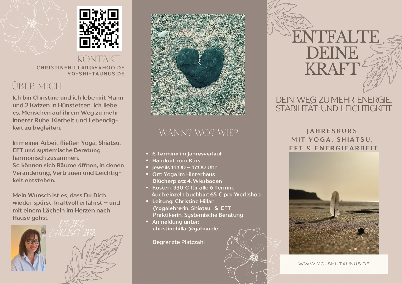Auf dieser Seite findest Du viele Informationen zu Yoga, Shiatsu, EFT, systemischer Beratung und meiner Arbeitsweise. Melde Dich gerne, wenn Du Fragen hast oder einen Termin vereinbaren möchtest.